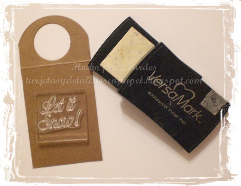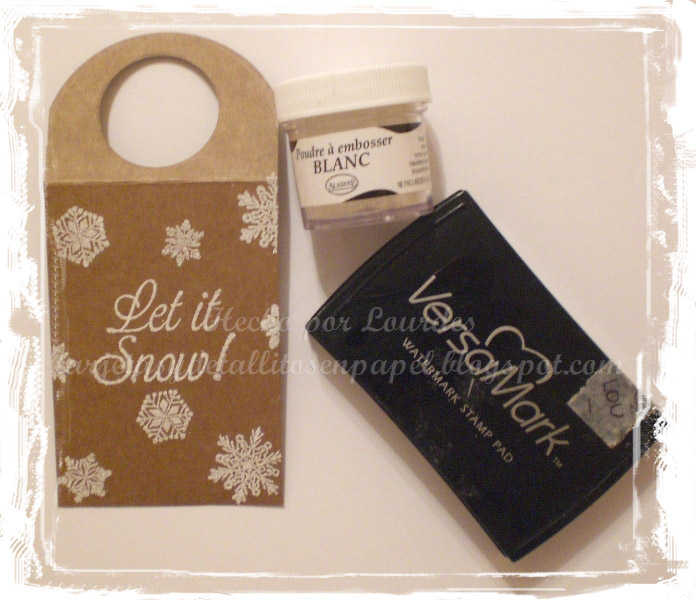 Para comenzar a decorar, he usado un sello con un texto navideño y coloqué tinta Versamark para fijar los polvos