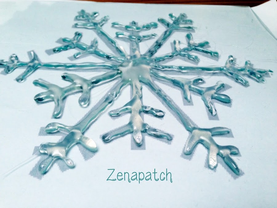 Espera unos segundos y vete despegando despacito tu copo, ya lo tienes! ¿ves qué fácil? para colgarlo, te recomiendo que uses nylon de pescar o hilo transparente, para que parezca que flota. (perdón por la calidad de la foto, con el corre corre... )