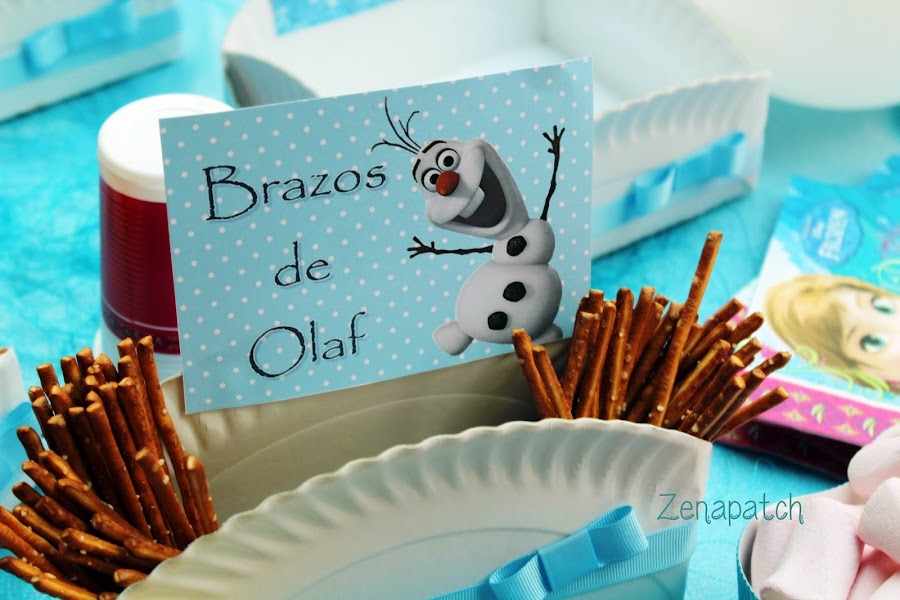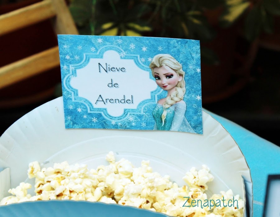 Es otra cosa también muy fácil y vistosa, a mis invitados les encantó! y sólo necesitas bandejas de cartón y cinta adhesiva! Si quieres darle un toque más Frozen, utiliza algún detalle en azul; yo compré un rollito de cinta grosgrain, la rodeé y le hice un lacito que pegué con un poco de cinta de doble cara.