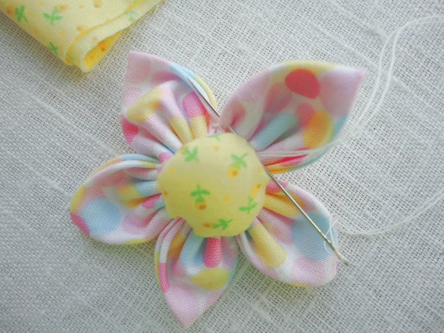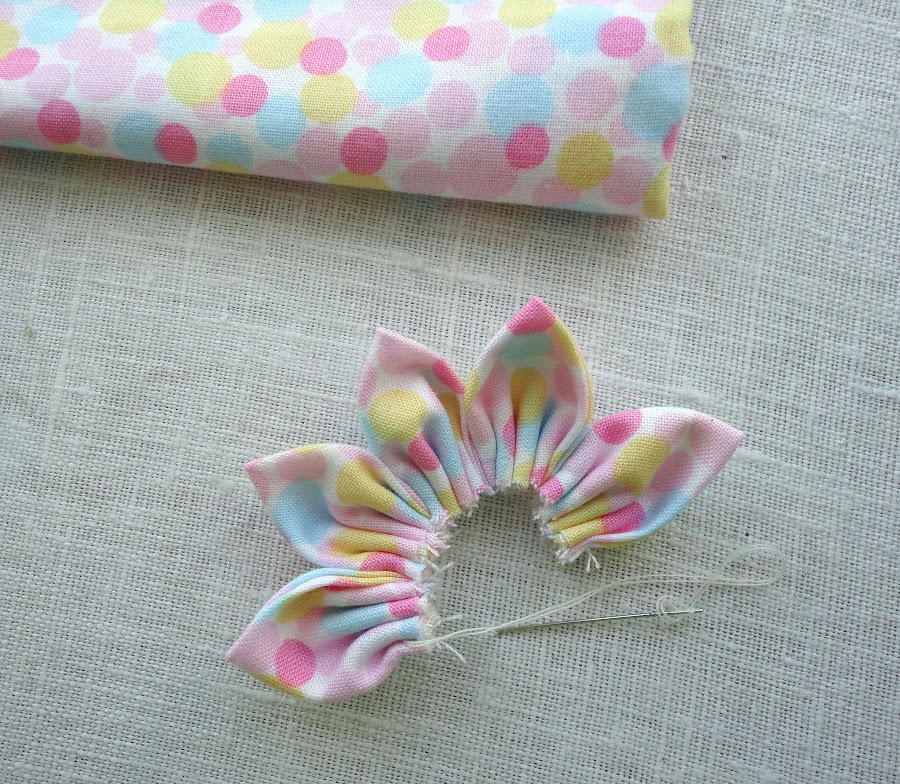 Doblar cada circulo en cuatro para coser cada pétalo de la flor. A medida que vamos cosiendo cada pétalo, los vamos uniendo uno al lado del otro.Cerrar el círculo cuando hallamos completado los cinco pétalos, cosiendo firmemente para que no se suelte.
