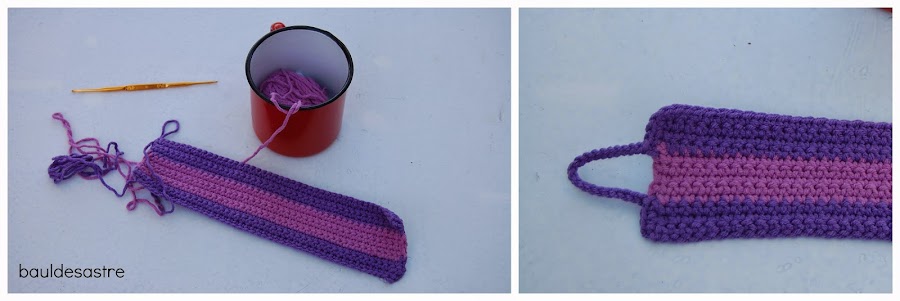 Por último, hacemos puntos bajos sobre el lateral y unas cadenetas al aire que nos servirán para sujetar el botón. Terminamos con más puntos bajos en la parte inferior.