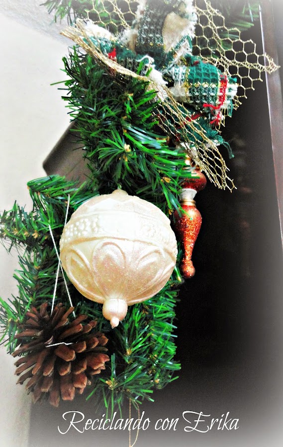 Otra idea que tuve fue decorar una guirnalda que pongo en un mueble de madera , alterne varios adornos con piñas , casi todas las personas que la han visto me han preguntado dónde la compre , me parece que mucha gente no tiene acceso a las piñas .. no lo se ?