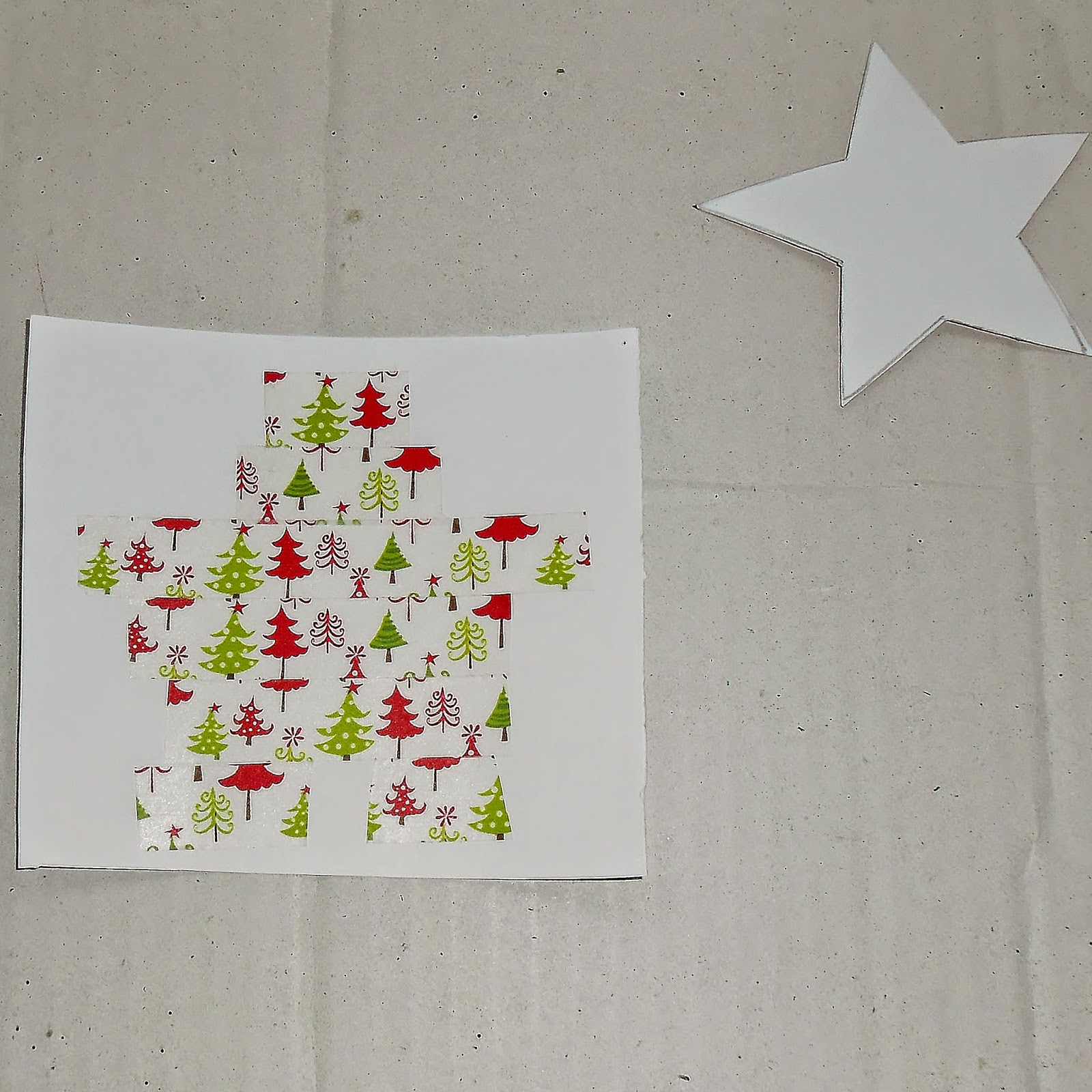 Damos la vuelta a la cartulina y vamos colocando el washi tape a gusto de cada uno cubriendo bien la parte interna de la figura. Para ello podemos trabajar en una ventana para ver la linea y no dejarnos nada vacio.