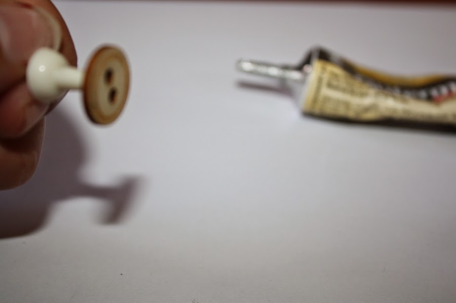 Poner un poco de pegamento en la chincheta, pegar el adorno y dejar secar.