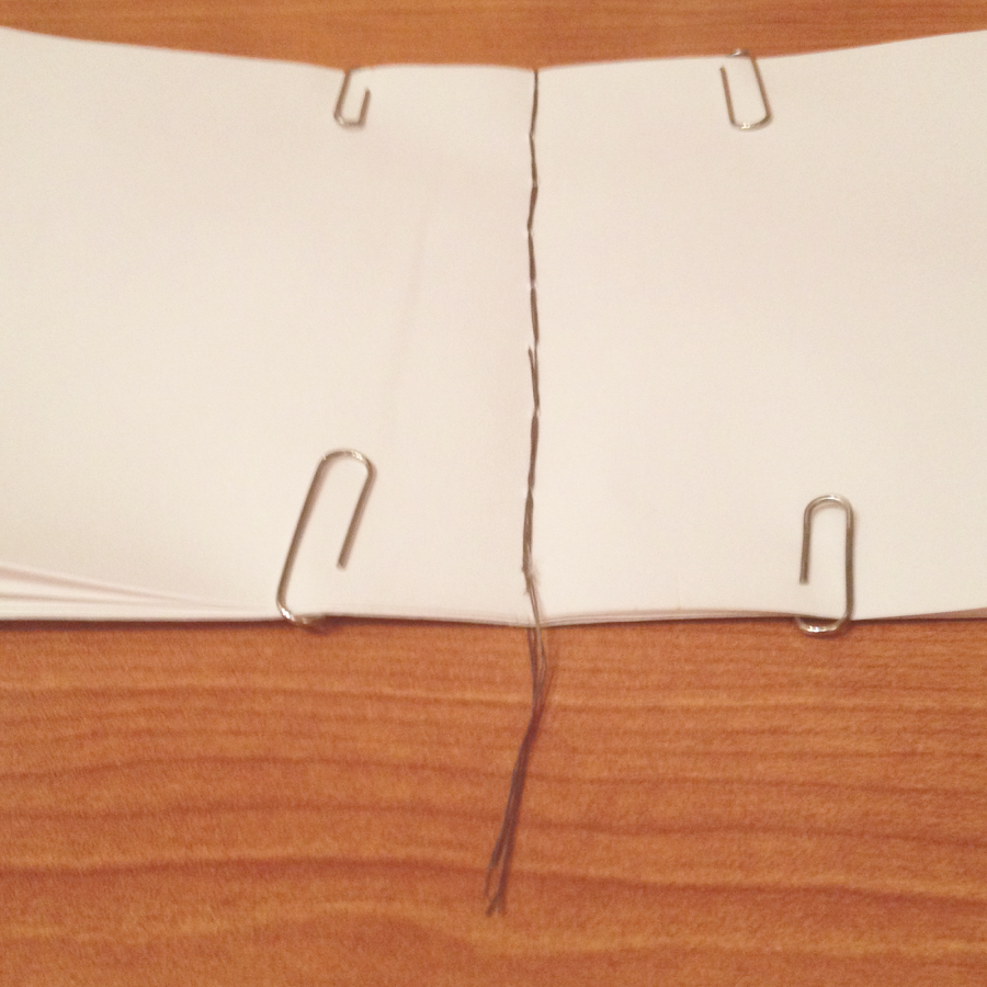 - Cosemos por la mitad, uniendo todas las hojas y la cartulina.
