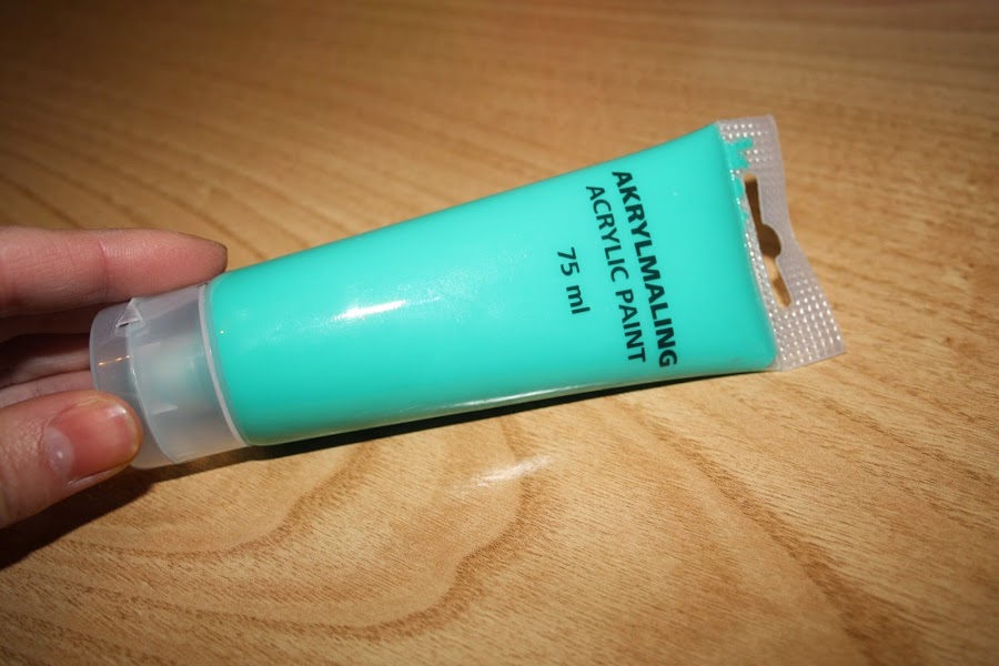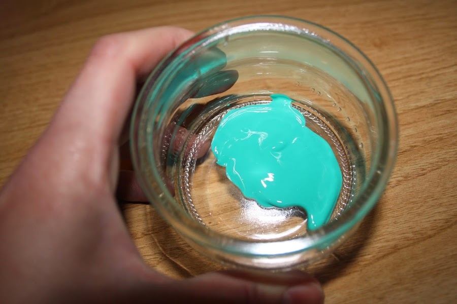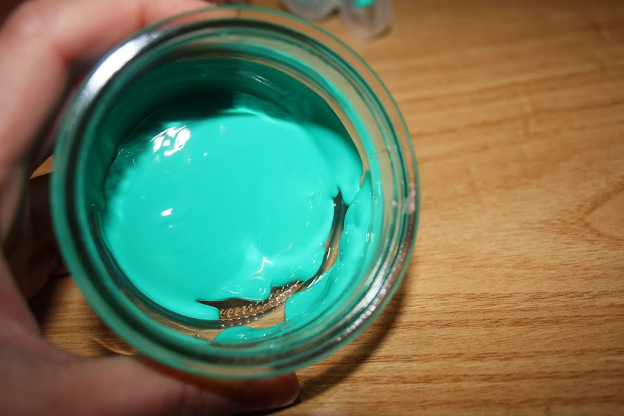 Vertemos un poco de pintura acrílica dentro del tarro de vidrio y vamos extendiéndola por todo su interior. Hay que tener paciencia para rellenar todo el fondo así que lo haremos dando golpecitos en el tarro en todas las direcciones.
