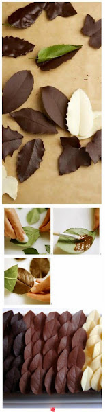 Sencillas pero muy vistosas, sólo necesitas recoger las hojas que más te gusten, las limpias, con un pincel las cubres con una fina capa de chocolate, las dejas secar y cuidadosamente levantas las hojas. Quedarán perfectas y muy naturales. Genial, ¿verdad?
