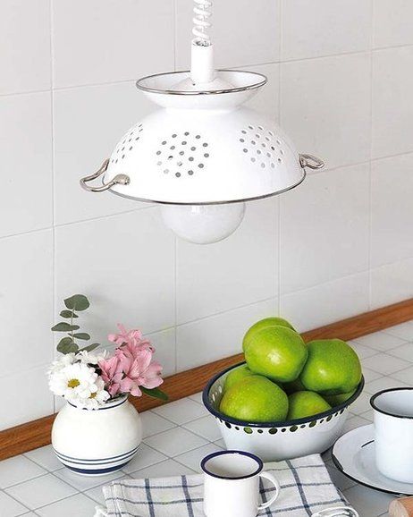 Una lámpara de lo más original y divertida para la cocina, puede ser una realizada a partir de un viejo colador. Si el colador que vas a utilizar no está en malas condiciones mejor, pero si ves que ya no tiene un color uniforme, con una capa de pintura como nuevo, un cable, una bombilla y listo. Ya tenemos lámpara para nuestra cocina y será la que se lleve todas las miradas.