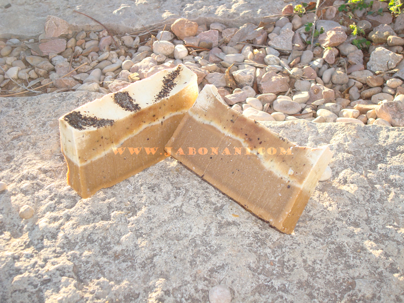 En cuanto a su composición en aceites es de aceite de oliva, aceite de coco, y aceite de almendras, además a la parte clarita le añadí en la traza oleato de limón que hice yo misma. A éste jabón no le añadí ningún aroma, huele a café y al propio aroma del jabón.