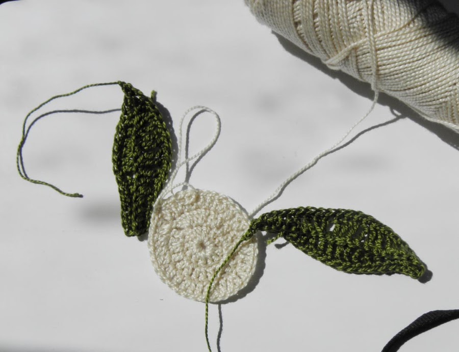 Hacer un circulo para la parte de atrás y tejer las hojas.