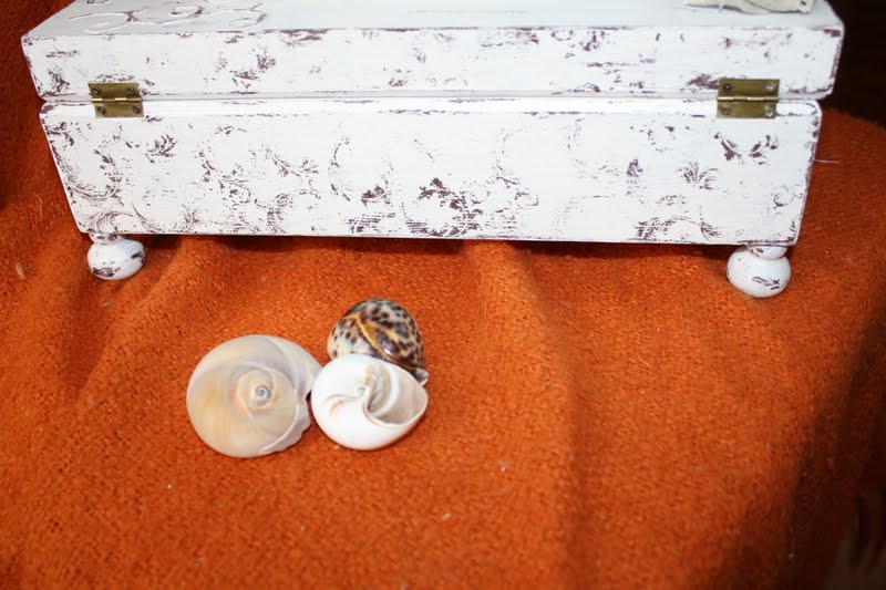 Bueno se me olvidaba....la caja esta imprimada con gesso, lijada.....pintada con un acrílico color chocolate.........pasada de velita, en diferentes zonas..........pintar con blanco roto (dos manos)........decapar.