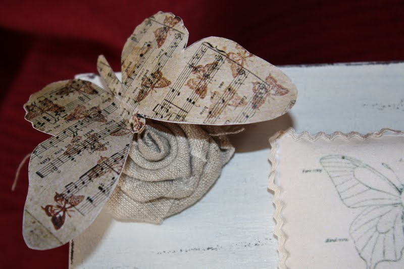 Enmarcando al transfer, estarcido con pasta de modelar........y unos sellos de mariposas............quería darle un aspecto......ummmm.........haber si consigo explicarlo......la intención era ""marcar"" unas mucho.......otras menos.......la ultima insinuarla.........dando la sensación de ""vuelo"" (ya, ya, se me va bastante la pinza....¡¡es lo que hay¡¡)