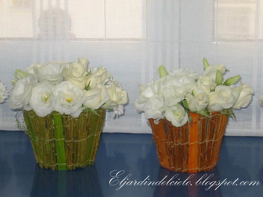 Me encargaron estos centros de flores para la primera comunión de Elena y Juan Luis que son hermanos y la hacen juntos. Cuando me llamó su madre y me dijo lo que quería pensé en hacerlos al estilo campestre en estos cestos de paja que me encantaron. No se aprecia bien en las fotos pero tienen un color muy bonito.