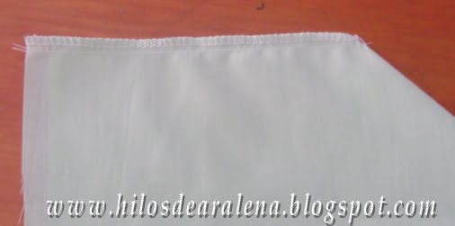 Por allí pasamos un elástico para fruncir, en la parte superior e inferior, empezando unos 15 cm antes de la costura del ángulo y terminando unos 15 cm después del 2º ángulo.