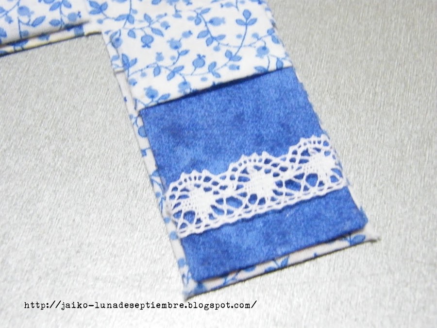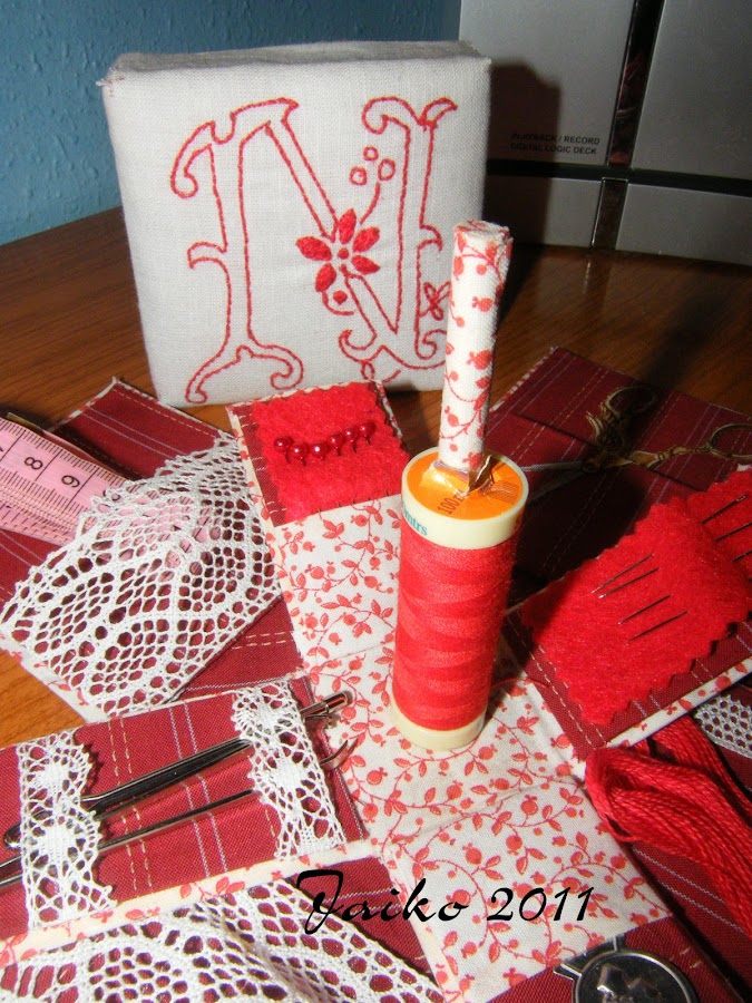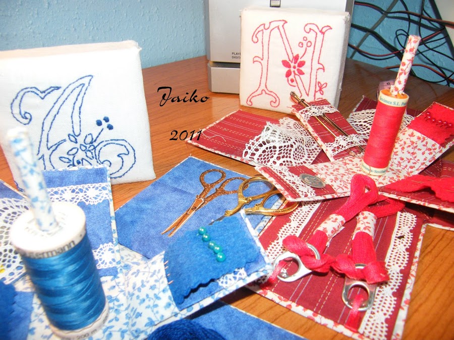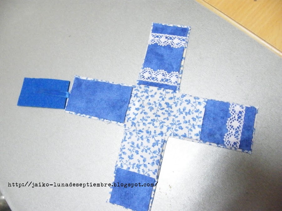 para pegarla hacemos una cruz y vamos pegando los bordes, 1º por fuera y después por dentro, yo he decidido bordar en redwork unas iniciales, pero podéis hacerlo con una tela que contraste, con lino etc.