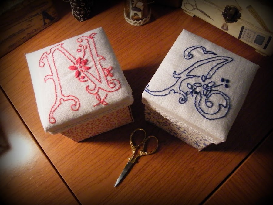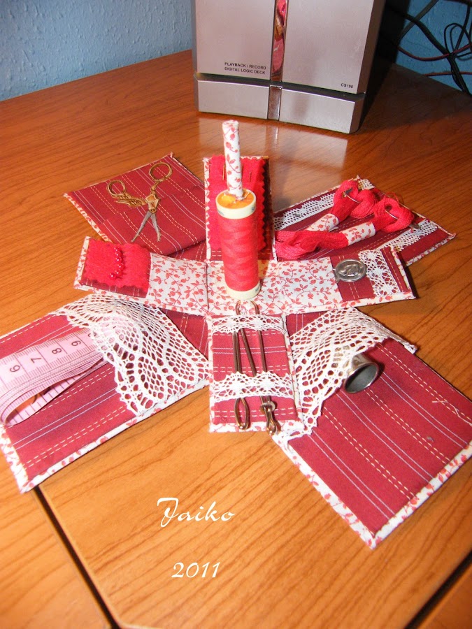 A lo que vamos, mientras, he dado rienda suelta al cartón, la cola, diversas telas y demás trastos para hacer un par de costureros victorianos, los vi por la red hace tiempo, busqué la información sobre como hacerlos y... manos a la obra.