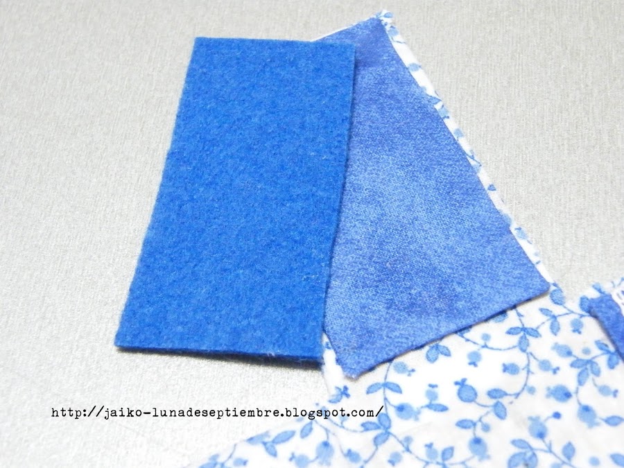 4) recortamos de la misma manera la tela de la parte interior del costurero y forramos las piezas de 9,5 x 8