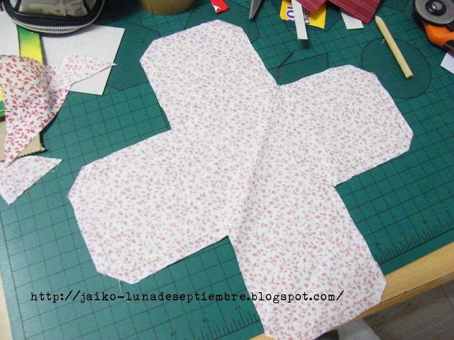 2) Con las piezas unidas recortamos un trozo de tela con la forma que hemos obtenido dejando 1cm en los bordes para doblar hacia dentro al pegar.