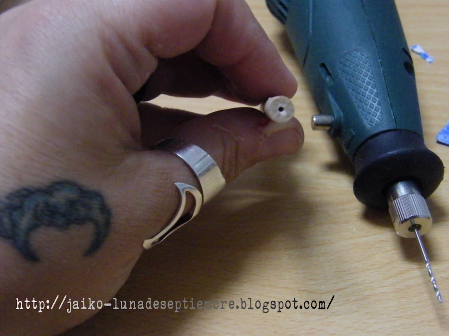 para sujetarla en la base con el mini taladro he hecho un agujero guia y desde la base de la caja pequeña, desde abajo le he puesto un tornillo, de verdad pensabais que iba a hacer un trabajo sin herramientas?? jejejeje