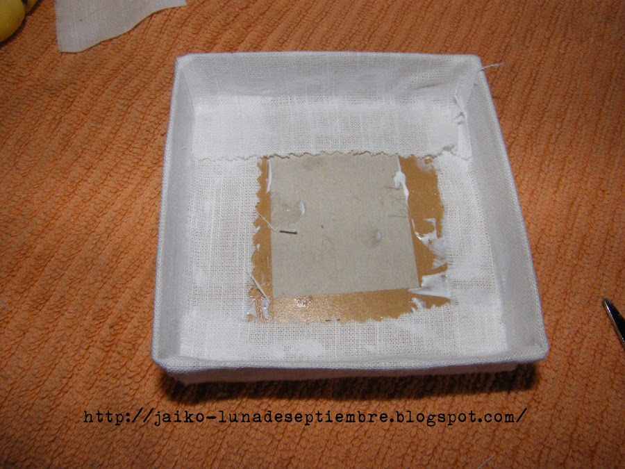 para la parte interior de la tapa, cortamos una pieza de tela de 9 x 9 y la pegamos dentro.