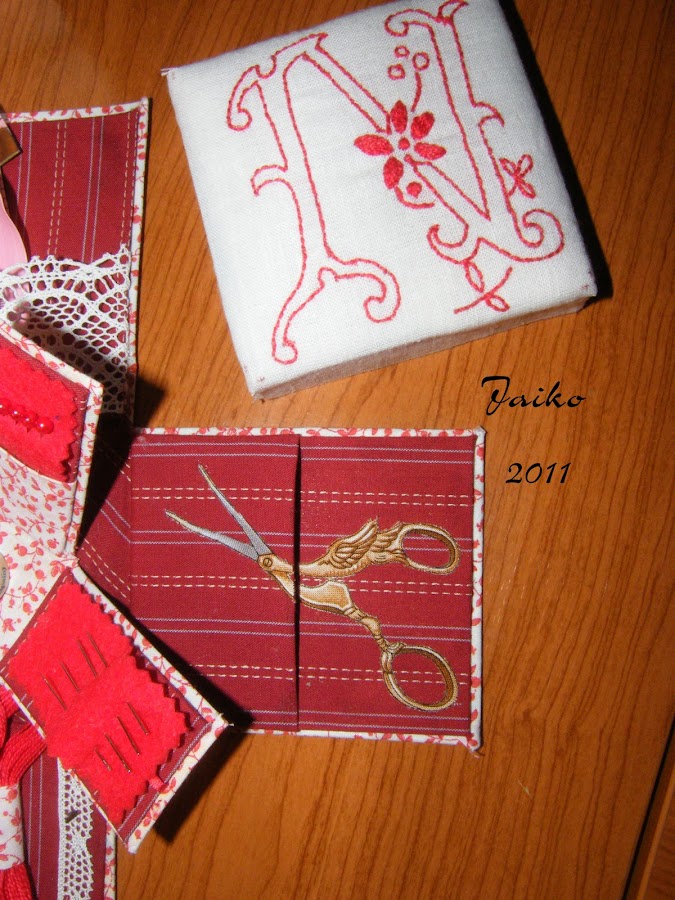 7) Pegamos las caras de dentro sobre las de fuera, tanto en la caja grande como en la pequeña, poniendo las cintas que hayamos elegido, yo en puesto unos pequeños bolsitos con un trocito de tela, fieltro para las agujas, puntillas para sujetar etc.