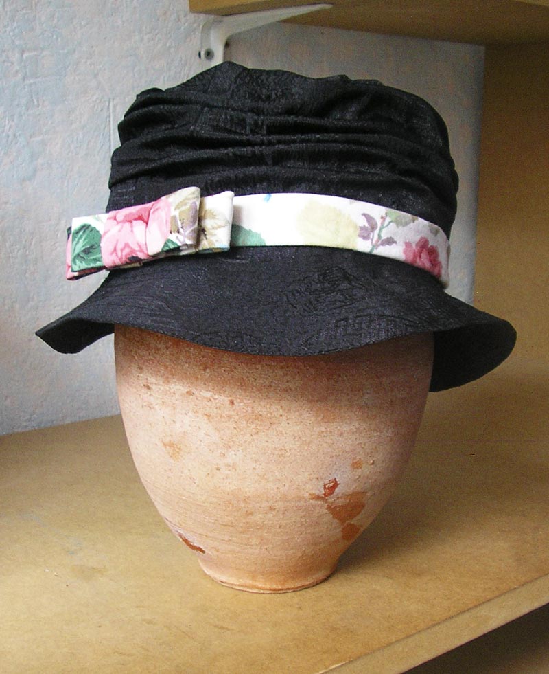 Detalle del adorno del sombrero negro con un floreado lazo zapatero:
