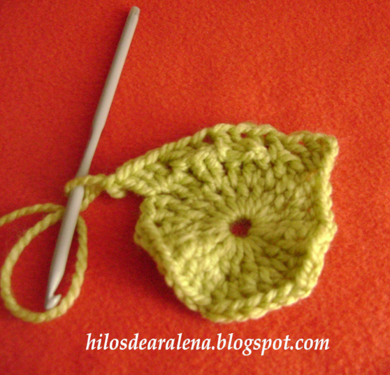 Comenzamos cada cuadrado haciendo una anilla con dos vueltas de lana alrededor del dedo. En ella se hacen 3 cadenetas y las 19 varetas de la primera vuelta