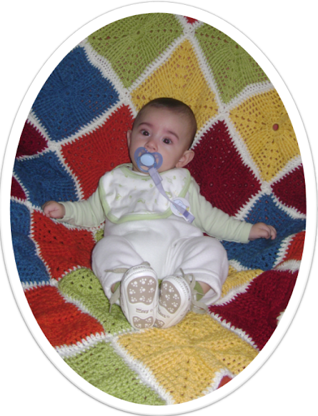 Esta labor la encontré en la revista Labores del Hogar N° 474 de Febrero 1998. En ella se muestra una manta en un solo color , se ve muy linda pero yo preferí colores vivos porque a mi nieto le llaman mas la atención