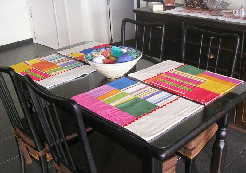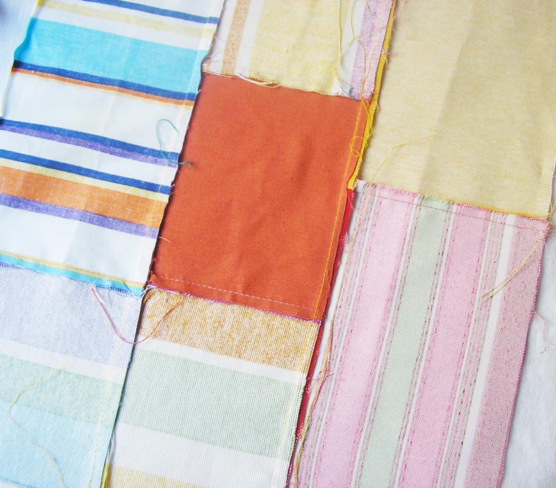 Puse este trozo de tela blanca con piquillo rojo. Primero coses el piquillo a la tela banca y luego a al parte de los trozos.