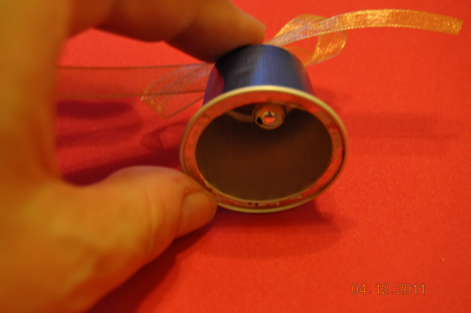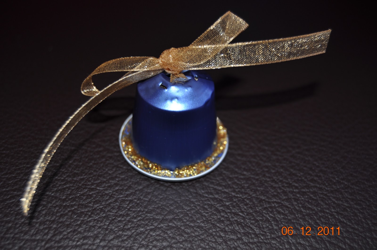 Y, como estaba inspirada, he utilizado más cápsulas de nespresso para hacer unos imanes para la nevera con forma de árbol utilizando fieltro. Las bolitas también están hechas con el glimmer dorado.