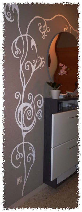 Para hacer éste otro, utilicé dos "pinceles" del Photoshop que amplié con el programa Posteriza, saqué la plantilla para poder dibujarla en la pared, y después la fui pintando..... Éste me dió mas trabajo, porque la pared llevaba estucado, pero quedó muy bien.