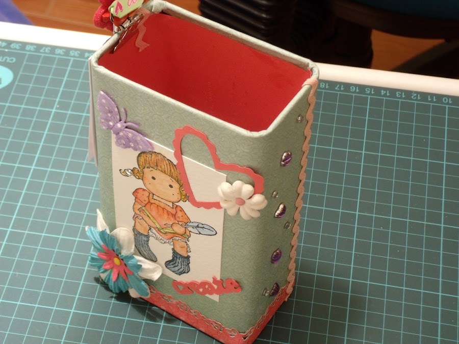 La magnolia está pintada con lápices acuarelables, con la Slice he cortado el create y el corazón. La parte de abajo del bote está hecha con una troqueladora de borde. Los papeles que he utilizado son de paper doll, me gusta mucho como ha quedado la combinación de colores! En uno de los laterales le he puesto brillantitos y ondulina.