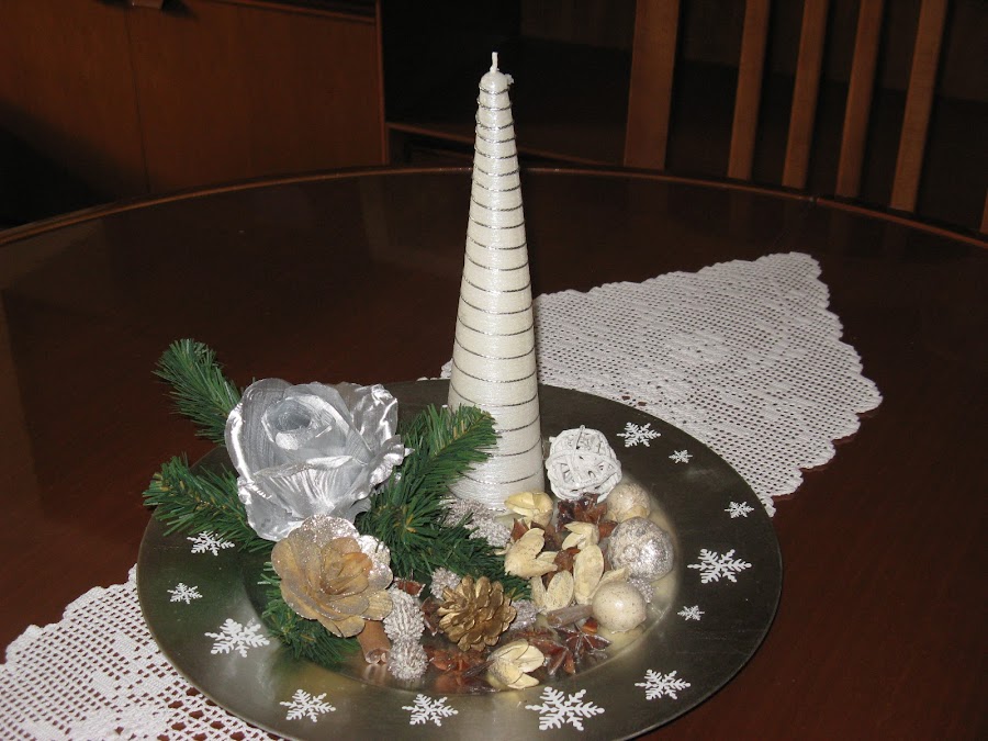 Por ultimo el centro de mi mesa del comedor, que como veis como el arbol esta en tonos plateados ,dorados y verdes.