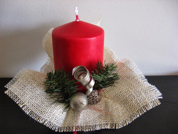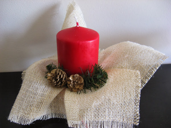 Com que vaig tenir que comprar més arpillera, vaig adornar aquestes espelmes . Les rames d"abet i les pinyes ho he aprofitat d"adornos vells que tenia per casa.