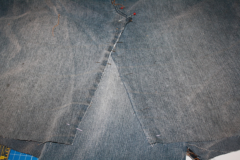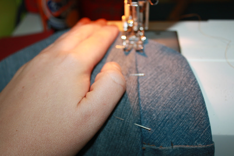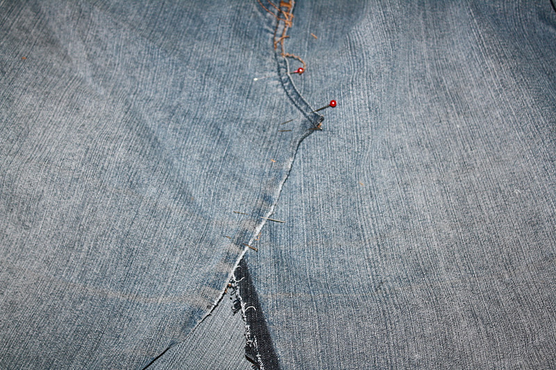 Ponéis alfileres, y lo coséis a máquina, respetando las marcas de los pespuntes del pantalón ""desvencijao"".