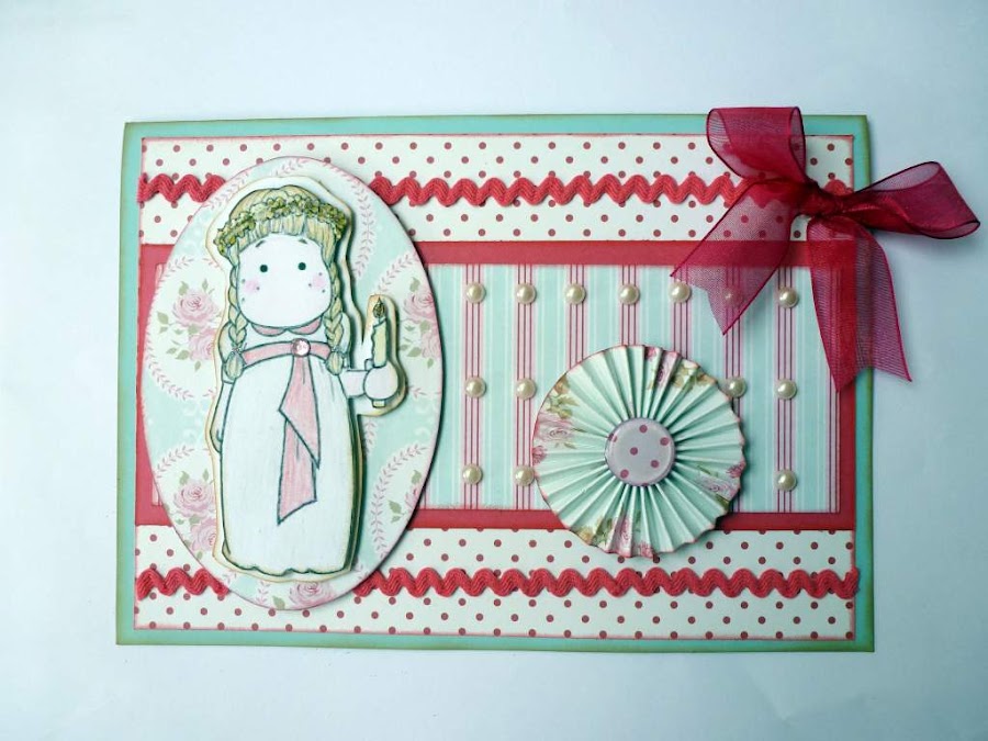 Hice una tarjeta muy de niña, con papeles Tilda y con una imagen de Magnolia muy dulce, pintada con pinturas de palo.