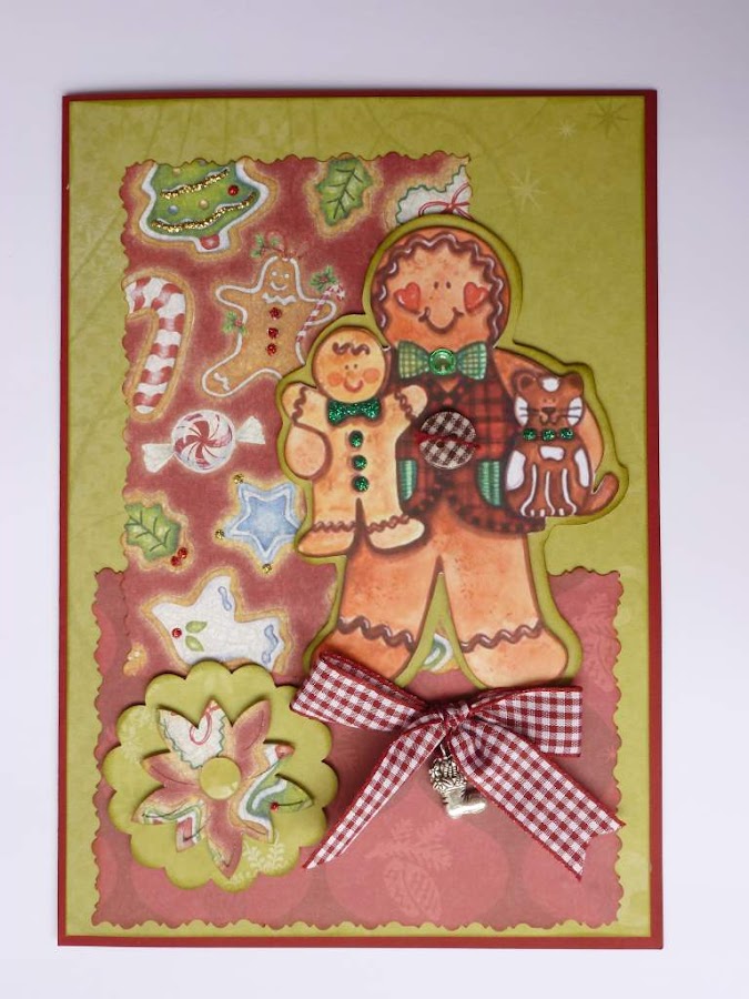 La segunta tarjeta es más desenfadada. Una simpática galleta de jengibre, con hermanito pequeño y gato incorporados, y papeles de K&Company. Otra vez lazo vichy rojo y un charm de una bota navideña.