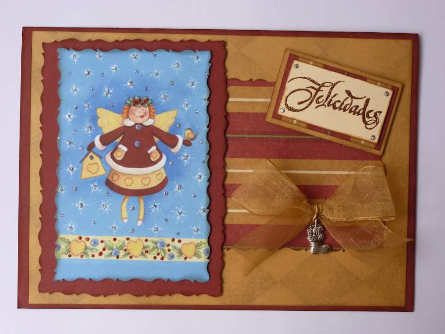 Y en esta última he colocado una imagen que llevo utilizando varios años en Navidad. Me resulta muy amable. Charm de botita, sello de "Felicidades" y papeles de K&Company. Creo que he comprado ya todas las colecciones de Navidad que tienen. Tendrían que nombrarme clienta del año, jaja.