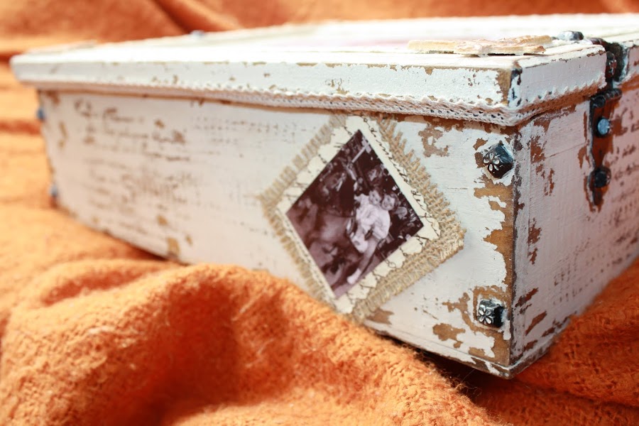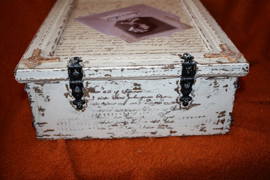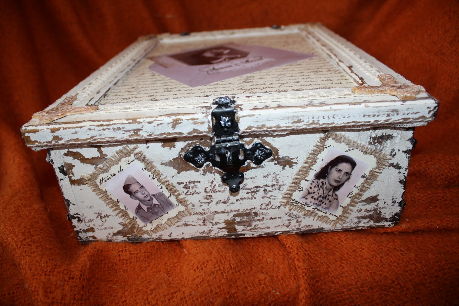 La caja la lije bien, le dí vela en diferentes puntos, un par de manos de blanco roto............y ¡¡decaparla¡¡. Nada mas, sobre eso empecé a jugar.........decoupage, tela, puntillas, sellos, siluetas...........