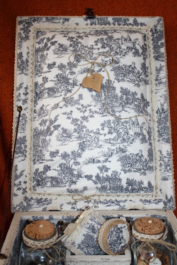 Y ahora el interior....sencillo.........forrado con tela TDJ. El hueco que había en la tapa; lo acolche. Alrededor y para rematar los bordes puntillas.