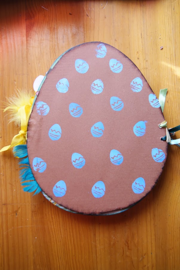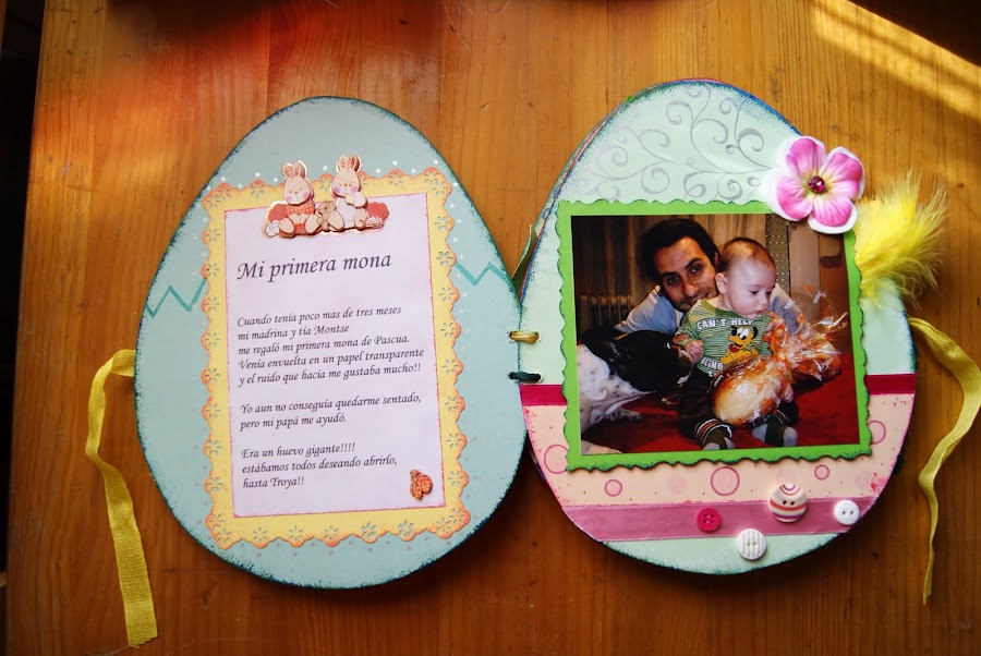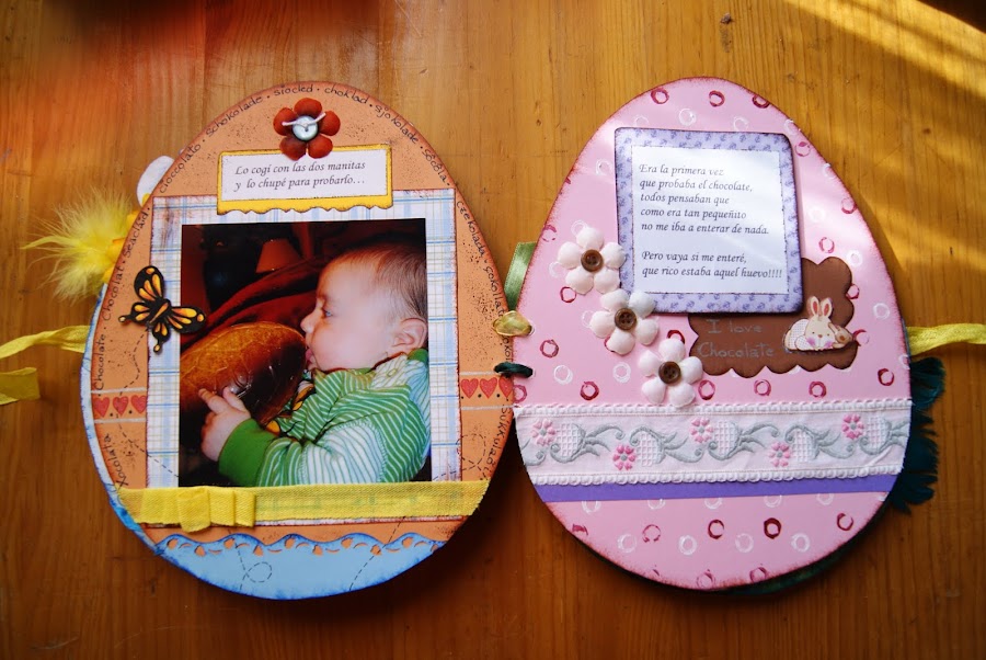 He utilizado papeles impresos y algunos los he hecho yo misma a falta de ellos,también lleva un sello de huevo que hice con una goma de borrar como ya viene siendo costumbre en mí ultimamente.Y bueno el resto cintas,botones y algun sticker ,fieltro, plumas ,en fin todo lo que se me ocurrió!!