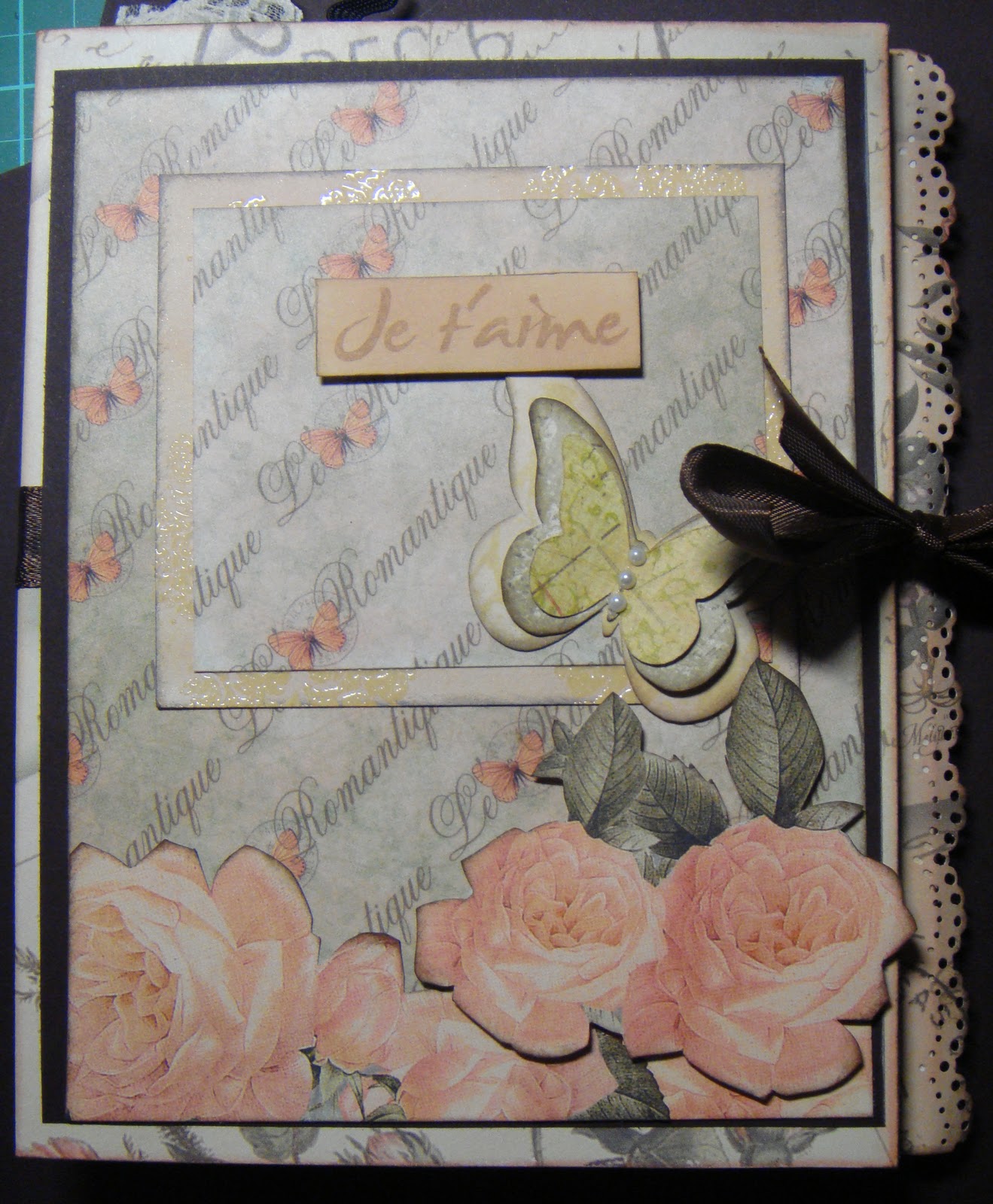 Los papeles son de Graphic 45 de la colección Le romantique pero modificados con distress tattered rose para que quedara mas armónico con el resto del conjunto (eran muy verdes), las mariposas en 3d fueron un regalo de Yolanda, gracias! Cuando lo abrimos nos encontramos con un tag hecho con la misma distress, polvos de embossing negros, a la imagen postal de la esquina le he agregado cartón corrugado entintado con distress walnut stain para darle mas relieve y por detrás tiene un bolsillo para guardar fotos en tags pequeños.