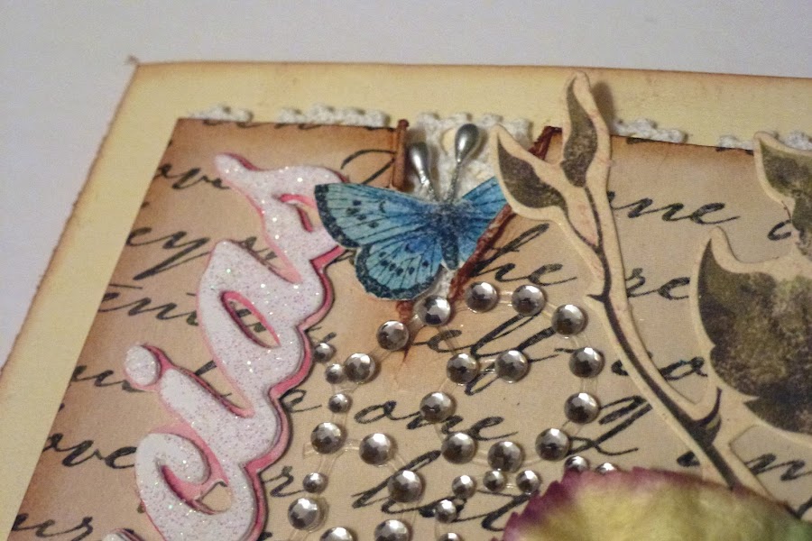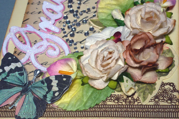Aquí os dejo el detalle de la parte superior izquierda, de como la mariposa aparece de entre la puntilla por esa rotura envejecida con Distress Ink - Tea Dye. La palabra gracias está recortada varias veces, con diferentes grosores de letra, en rosa y blanco y después embosada con Polvos de embosar brillantes