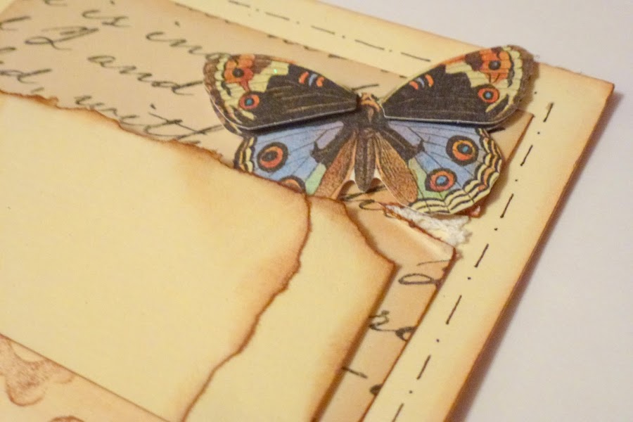 Como podéis ver, el borde está punteado con puntafinas marrón chocolate imitando a un cosido y todo está envejecido también Distress Ink - Tea Dye como en la parte delantera. Aquí tenéis el detalle de la parte superior con una mariposa de la misma colección de K&Company, igual que la de debajo, y un trocito de puntilla asomando tímidamente.