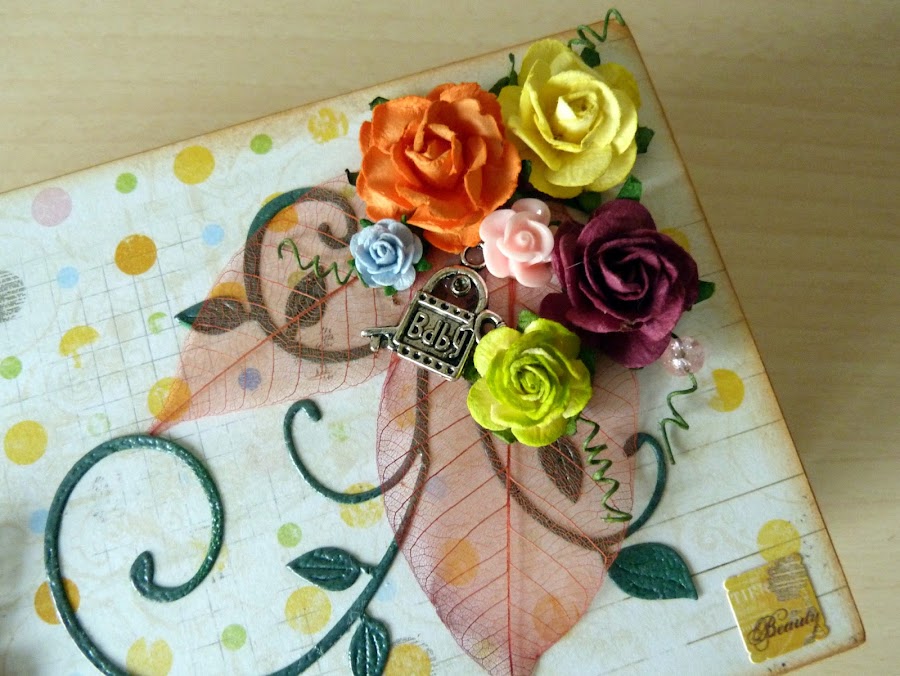 Las flores de papel son de Iamroses combinadas con un charm y flor de resina. Están pegadas sobre esqueletos de flores en tonos anaranjados.