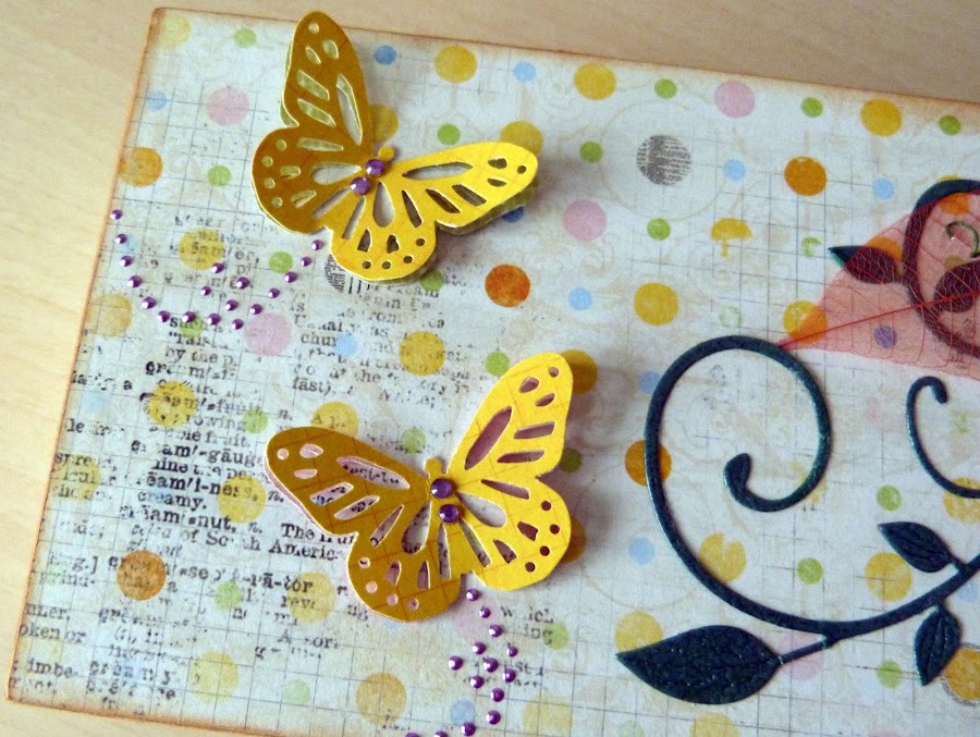 En el otro lado de la caja un par de mariposas de Martha Stewart con brillitos en el centro y formando las estelas Liquid Pearls en color Orchid.