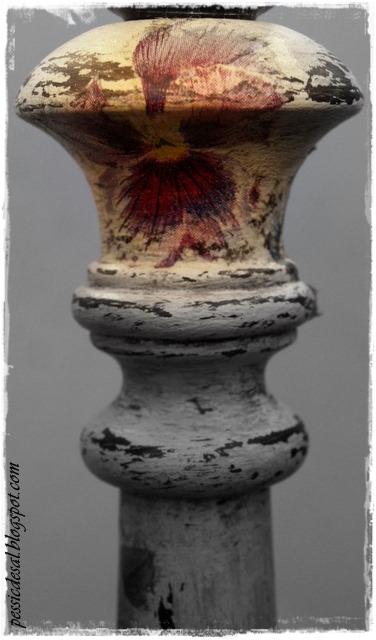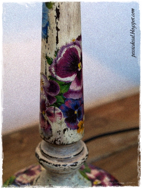 Lo siguiente es la parte bonita, la decoración,con découpage... en este caso, elegi unas servilletas con pensamientos, unas flores con esos colores tan preciosos y que me parecieron ideales,porque esos colores resaltaban perfectamente sobre la pintura clara, fue verlas y verlas ya puestas. Además le dan erse aire romántico que quería que tuviera, y una vez pegadas, parecía que fueran pintadas...