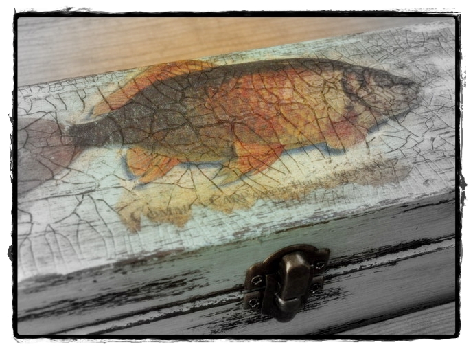 El segundo intento ha sido una caja y con la misma técnica, pero esta vez, la segunda capa de pintura ha sido en color turquesa, para que el "pescadito" estuviera ambientado... y la diferencia es que con ella sí me he atrevido a aplicar el craquelado...tenía menos que perder , me parecía a mi... Y l verdad es que me ha gustasdo el resultado también, totalmente distinto, se nota mucho más la pátina porque la resalta el craquelado.