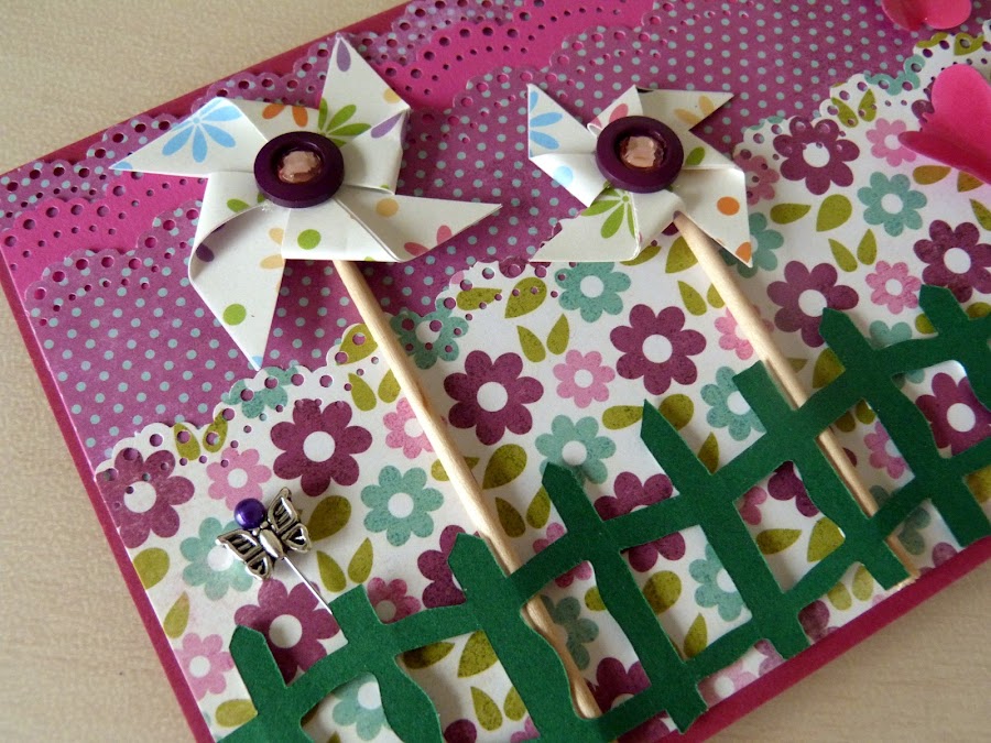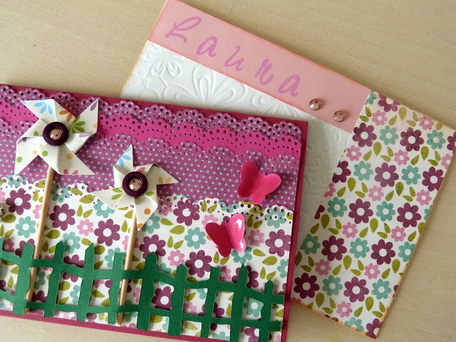 El troquel de la valla está cortado con la Craft Robo y el alfiler lo he terminado de decorar yo añadiéndole un charm de mariposa.