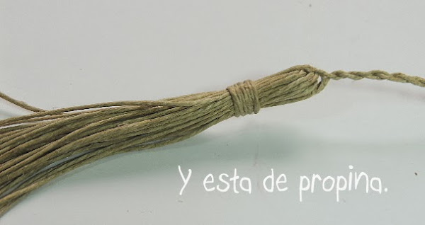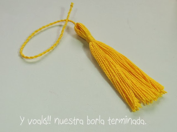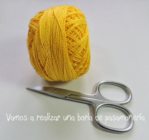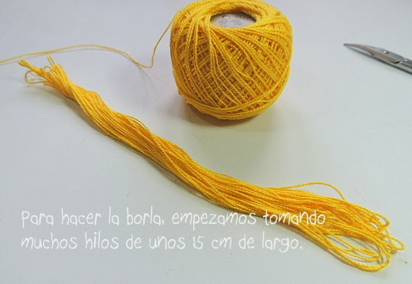 Este hilo que será el cordón de la borla, tendrá una largura de tantos cm x 4. Por ejemplo si queremos que la borla tenga un cordón de 10 cm, el hilo será de 40 cm.